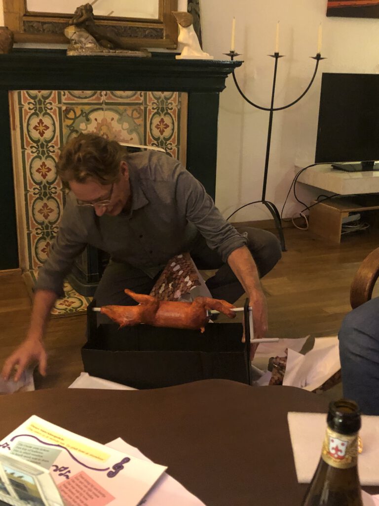 Dit jaar was het heel lastig om aan mijn surprise te werken, omdat ik mijn man had getrokken. Ik heb het dan ook een beetje simpel gehouden. Hij is een liefhebber van lekker koken en BBQ-en in de tuin. Daarom heb ik een BBQ met een speenvarken aan het spit gemaakt, die je echt kunt ronddraaien. Om toch nog iets extra’s te doen heb ik een pop-up boekje gemaakt met het gedicht voorin, dat hij moest zingen op de melodie van ‘Zie ginds komt de stoomboot’.