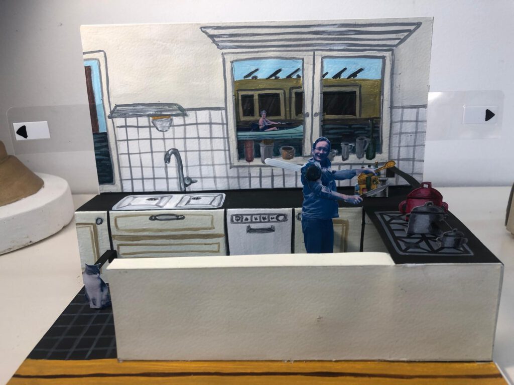 In 2022 was het mijn ambitie om een bewegende kijkdoos te maken. Het is niet alleen een surprise, maar ook een vooronderzoek voor een project, dat ik al jaren in mijn hoofd heb: een serie kijkdozen met het thema metamorfosen. In deze surprise is het thema Safari, waarin er zes verschillende elementen (dieren) bewegen op één as.